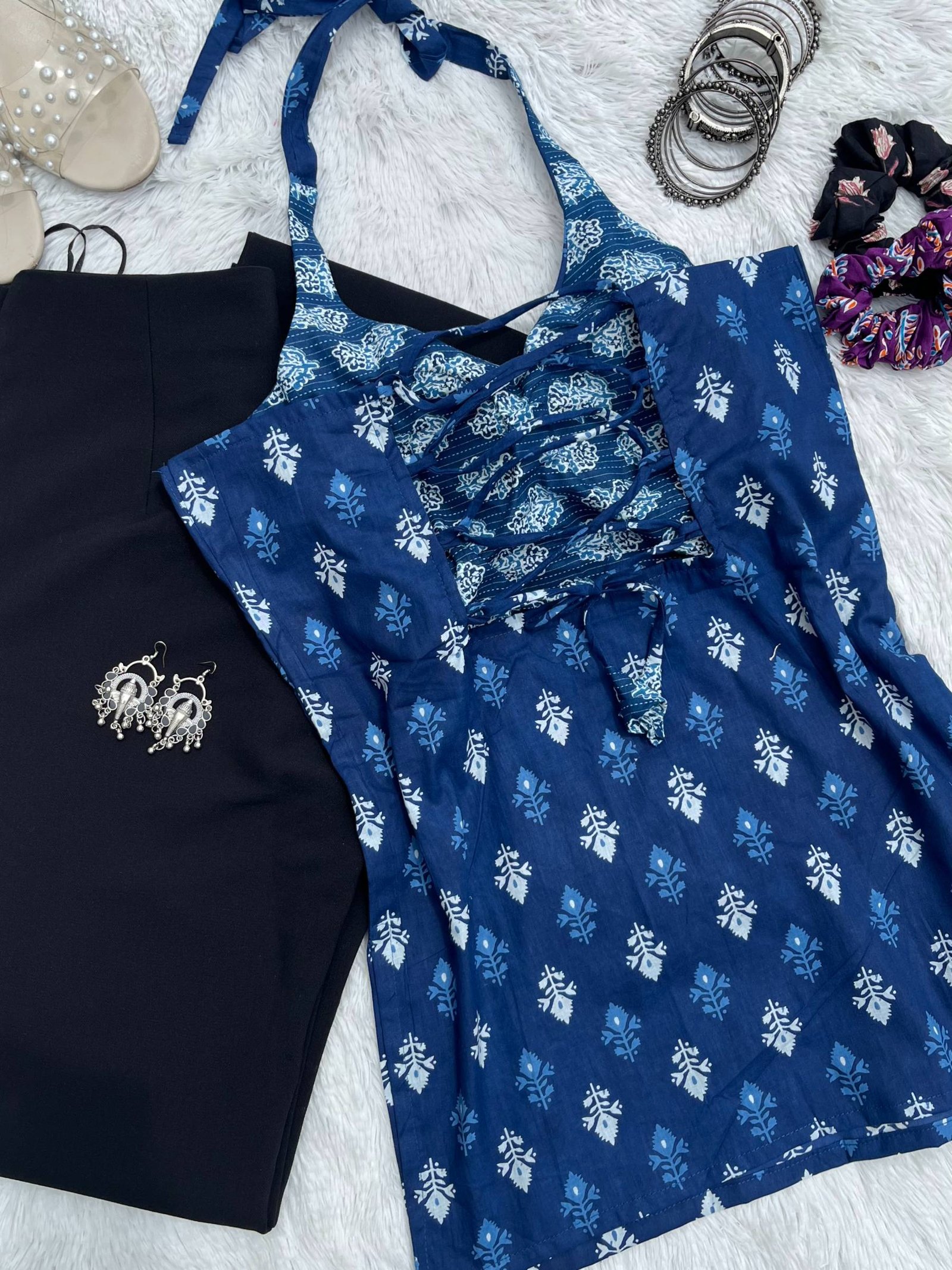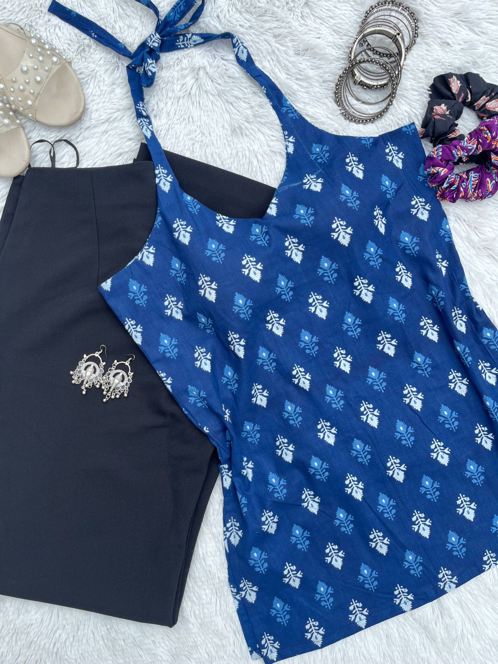 Product Discription- This chic Blue Halter Neck Back Criss Cross Cotton Kurti features a trendy back criss-cross halter neck design.. Made from breathable, soft cotton fabric,perfect for casual outings or festive occasions, it pairs effortlessly with leggings or palazzos for a fresh, contemporary look.