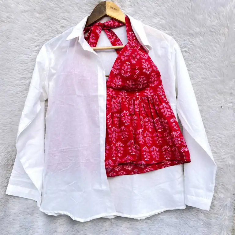 Product Discription-Elevate your everyday look with Combo of cherry red Halterneack Cotton Top and White Shirt — a summery cotton shirt paired with a halterneck top. Lightweight, breathable, and effortlessly stylish, this set blends traditional charm with modern flair. Perfect for casual outings or festive days. Add comfort and elegance to your wardrobe — shop now!