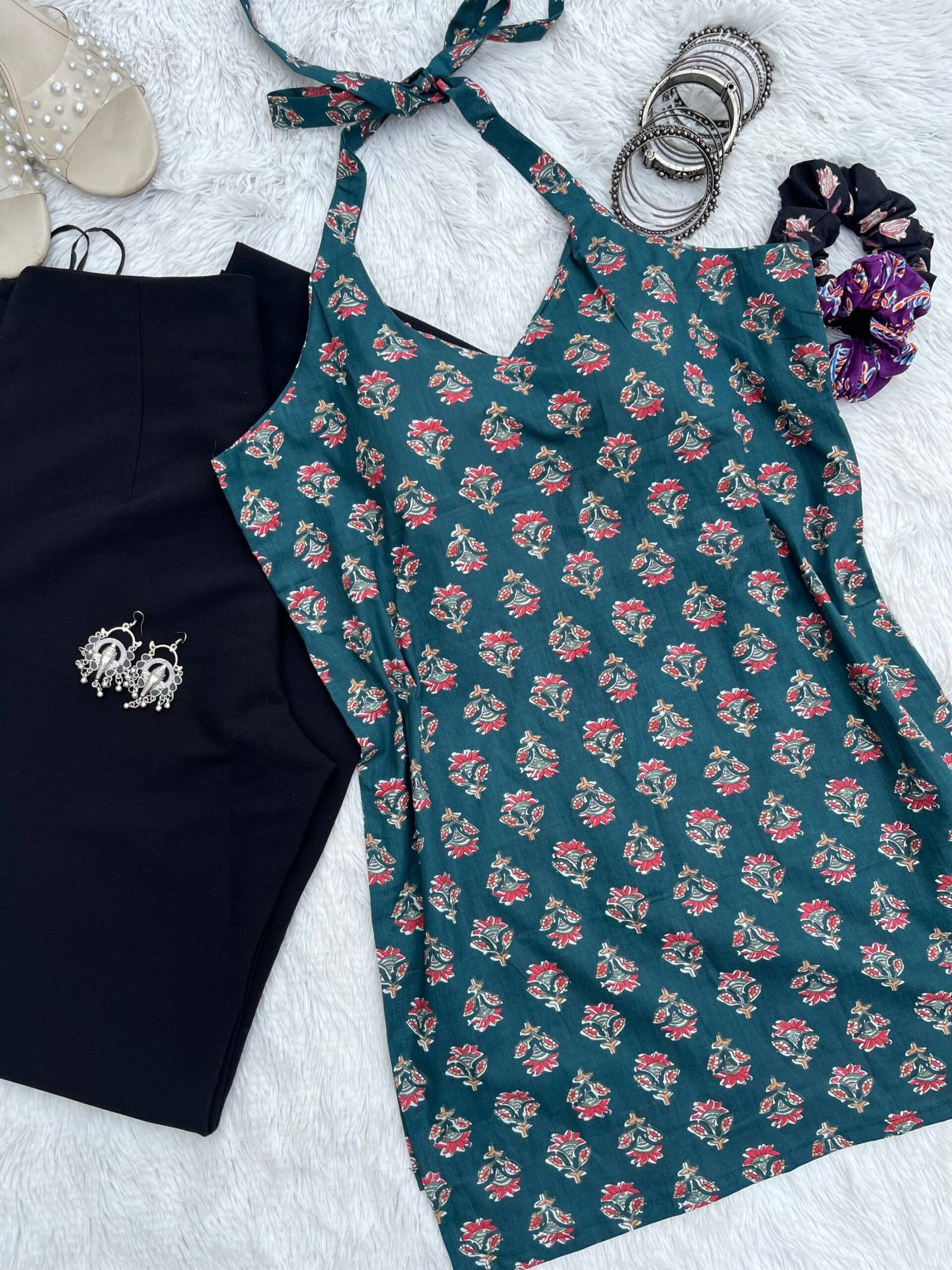 Product Discription- This chic Green Halter Neck Back Criss Cross Cotton Kurti features a trendy back criss-cross halter neck design.. Made from breathable, soft cotton fabric,perfect for casual outings or festive occasions, it pairs effortlessly with leggings or palazzos for a fresh, contemporary look.