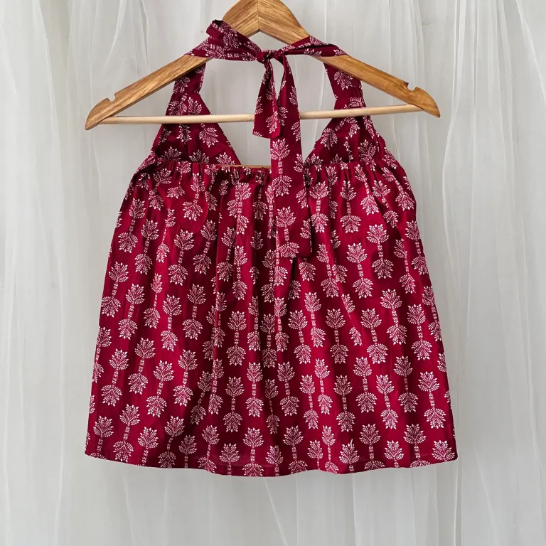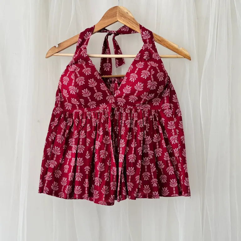Product Discription- Elevate your style with this Maroon Butti Designer Halterneck Cotton Top , soft, breathable, and effortlessly chic daily wear. The halterneck design in perfect look for your next vacation.