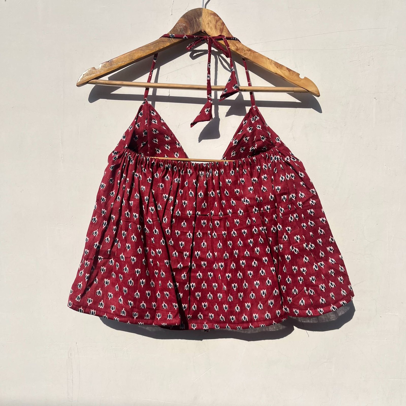 Product Discription- Elevate your style with this Maroon Butti Halterneck Cotton Top, soft, breathable, and effortlessly chic daily wear. The halterneck design in perfect look for your next vacation.