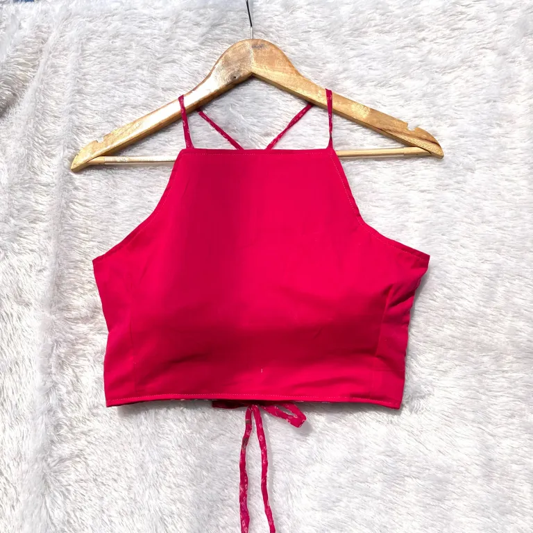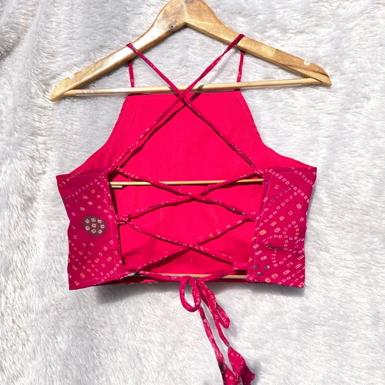 Product Discription- Step into effortless charm with Barikiyaan’s Pink Bnadhej Double Side Wear Designer Criss Cross Top. Crafted from soft bandhej , this can be wear from both sides and a stylish back criss-cross tie — perfect for chic, breathable comfort.