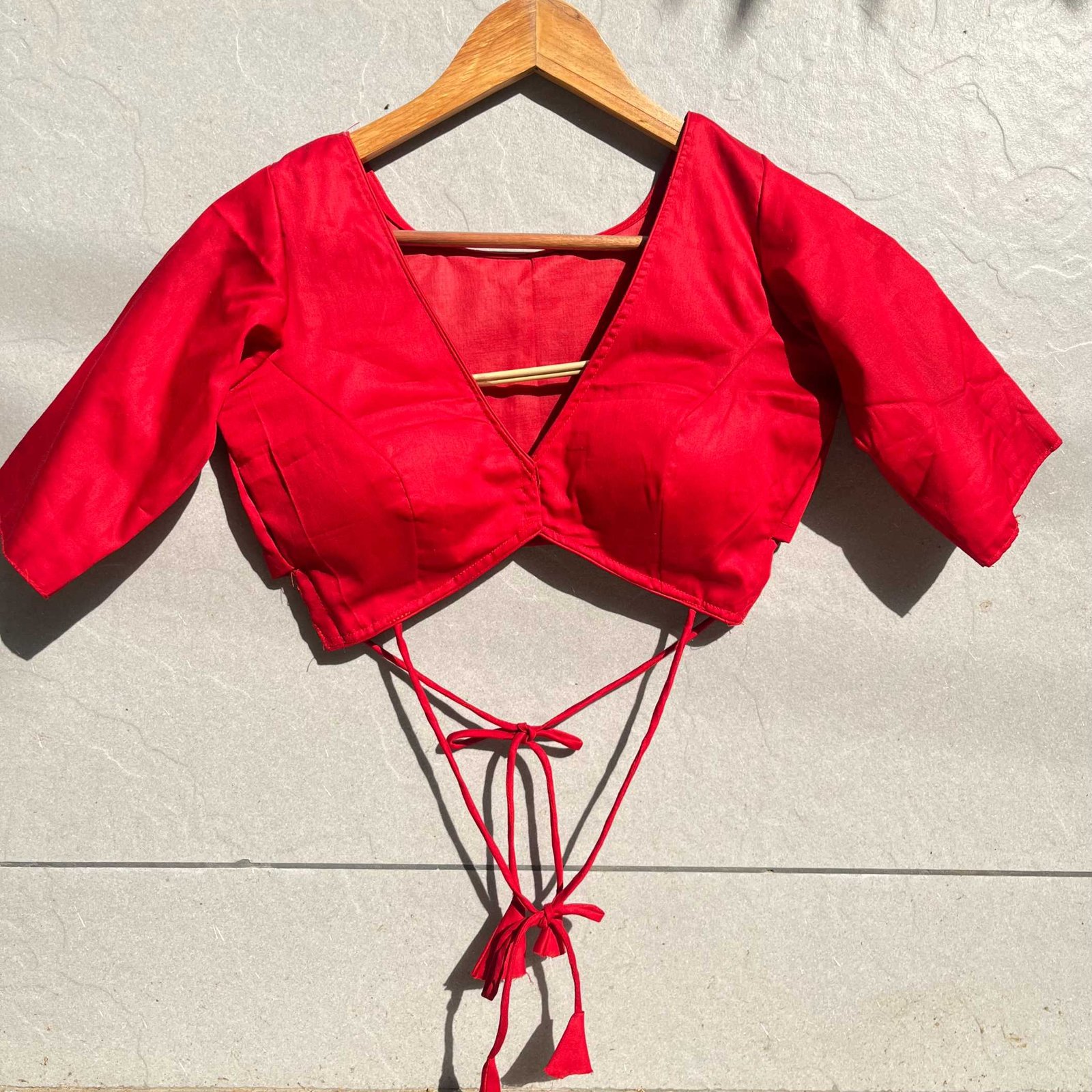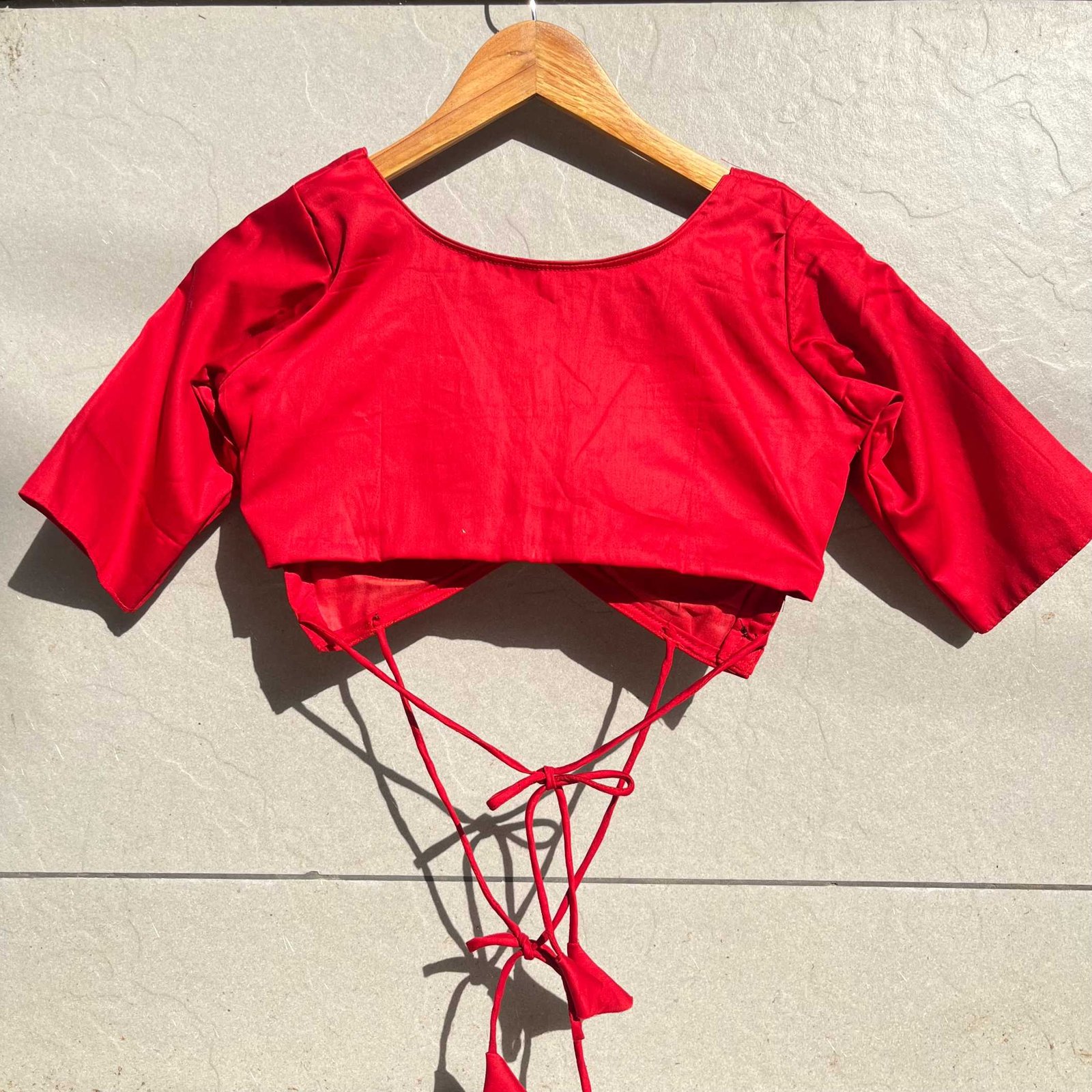 Product Discription-“Dazzle in the Red V-Neck Backless Blouse . This intricately designed piece combines elegance with tradition, available in all sizes for a perfect fit on any occasion