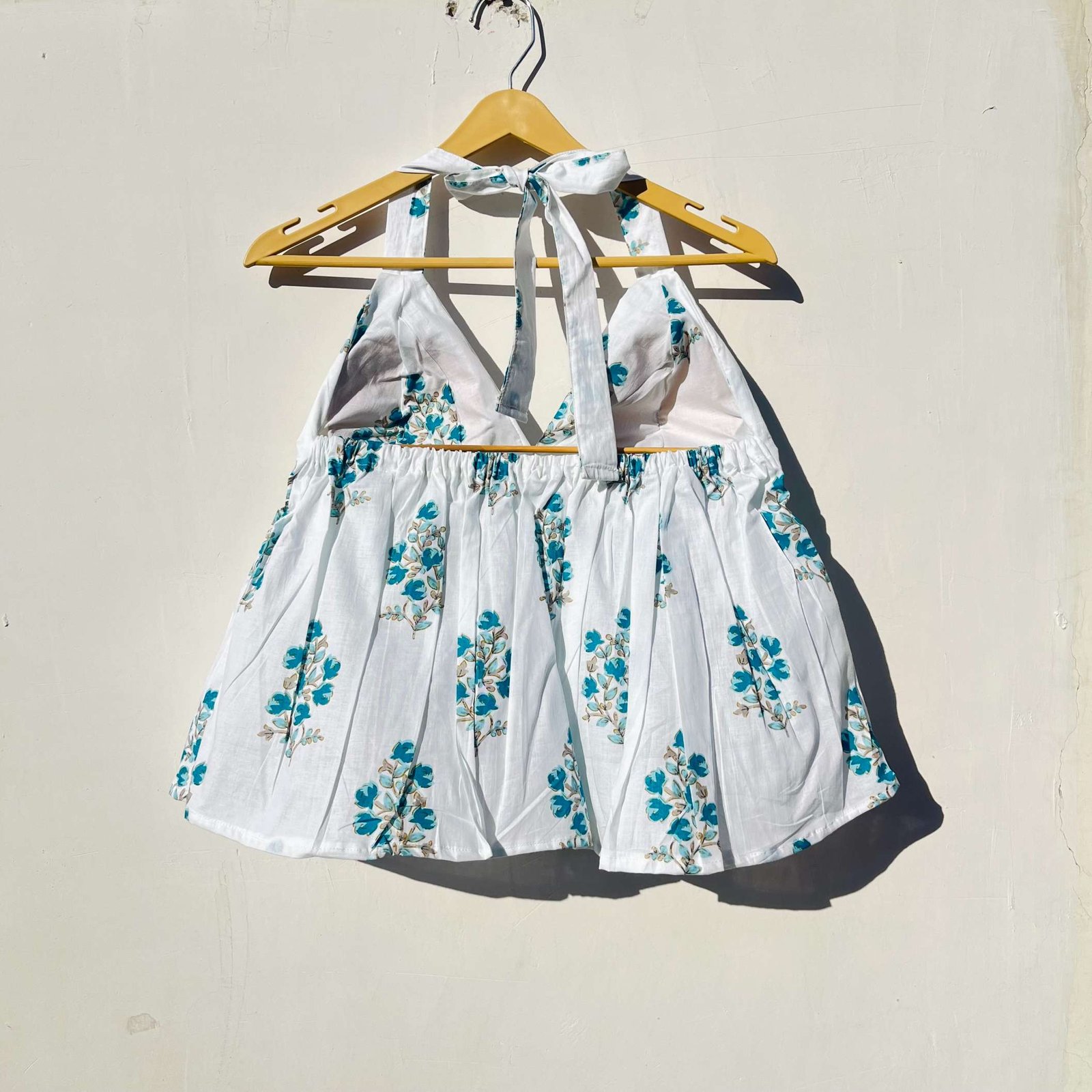 Product Discription- Elevate your style with this Sky Blue Floral Back Knot Halter Top, soft, breathable, and effortlessly chic daily wear. The halterneck design in perfect look for your next vacation.