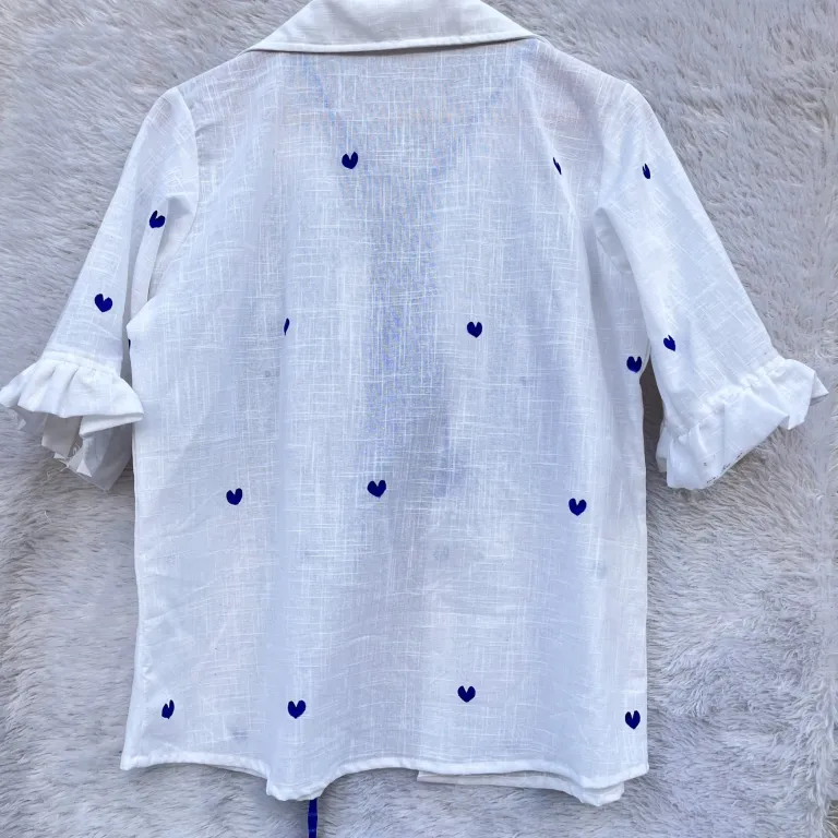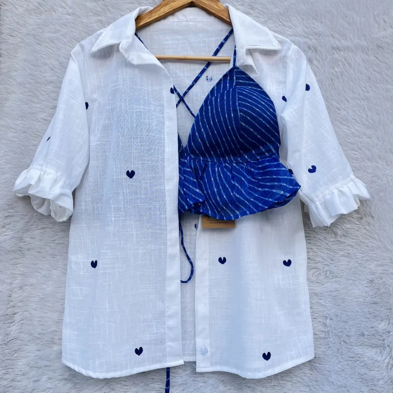 Product Discription- The Blue Heart Set- Combo of Shirt and Bralette — a summery cotton shirt paired with a back adjustable bralette .the pokkie hearts, Lightweight material, breathable, and effortlessly stylish, this set blends traditional charm with modern flair. Perfect for casual outings or festive days. Add comfort and elegance to your wardrobe — shop now!