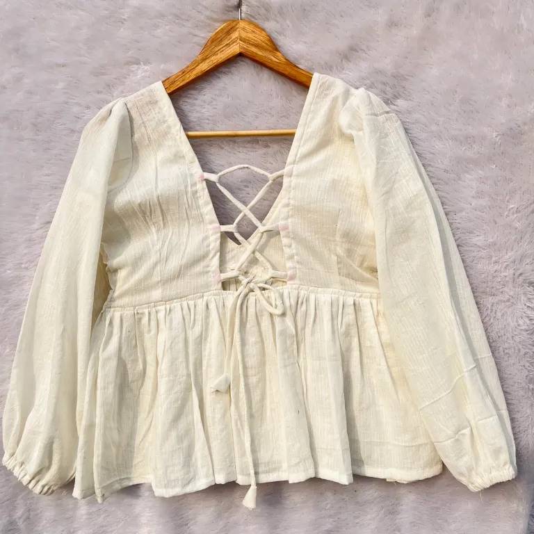 Product Discription- Elevate your style with this White Back Criss Cross Full Sleeves Cotton Top, soft, breathable, and effortlessly chic daily wear.Pair out these with denims and shorts.