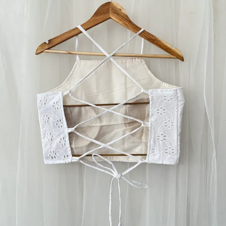 Product Discription- Step into effortless charm with Barikiyaan’s White Hakoba Designer Criss Cross Top . Crafted from soft hakoba cotton and a stylish back criss-cross tie — perfect for chic, breathable comfort.